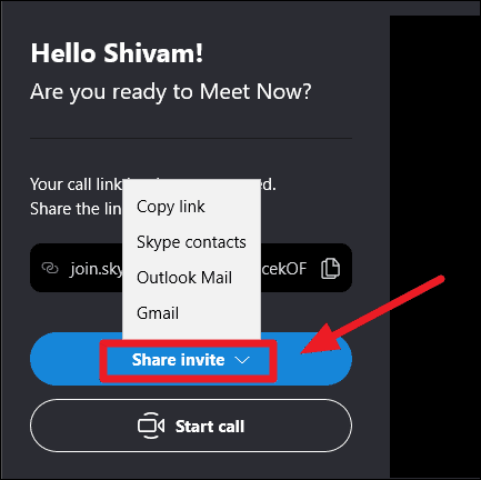 You can also use the 'Share invite' button to send the invitation link directly to your Skype contacts or via email to anyone.