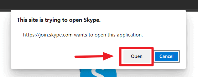 If you've received a Skype meeting invitation link, click on it to open it in your web browser. If you have the Skype app installed on your computer, a prompt will appear asking you to open the link in the Skype app. Click 'Open' to join through the app, or select 'Cancel' to continue without the app.