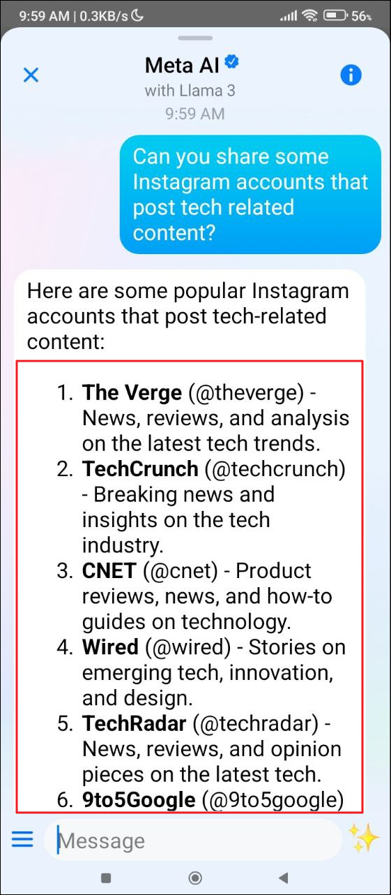 share Instagram accounts that post tech related content. - When you send the request, the chatbot will list the most popular Instagram accounts that fulfill your criteria.