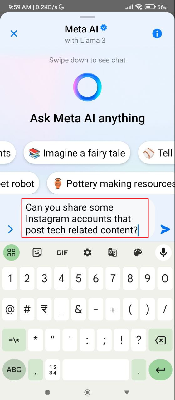 - When searching for Reels, keep in mind that they may not be present for all topics so Meta AI may not be able to always find and show them to you.