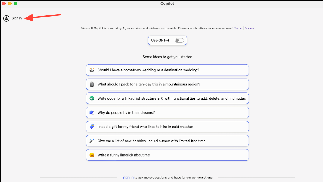Once signed in, you're ready to use Microsoft Copilot on your Mac. By default, Copilot uses the GPT-3.5 model with a 'More Balanced' tone for responses.