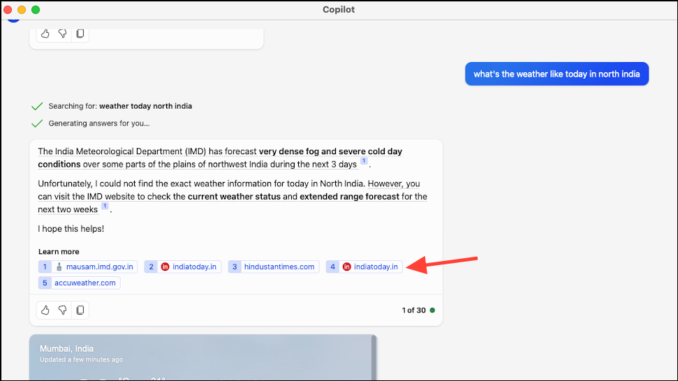 Step 2: Copilot will process your query and provide a response. It will also display the sources used at the bottom; click on any source to visit the corresponding website.