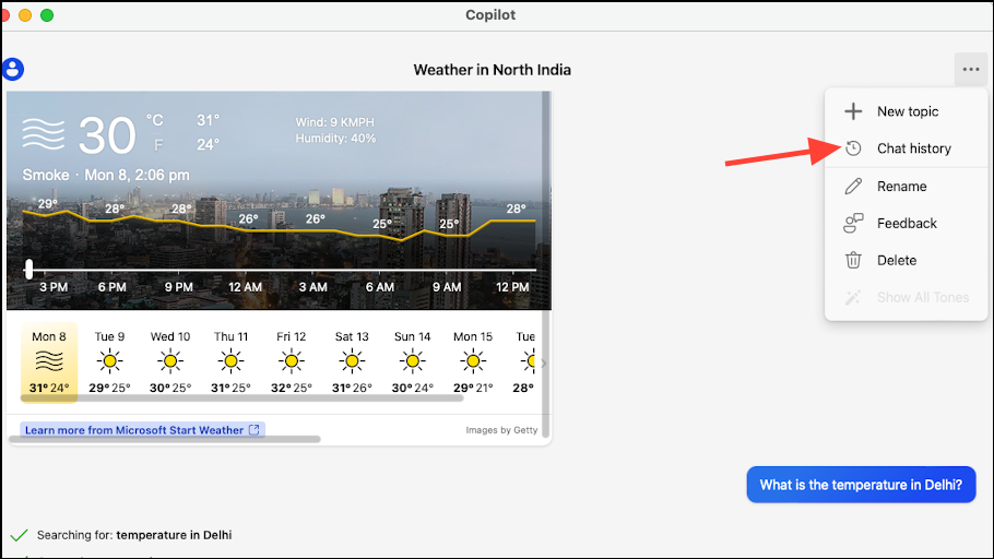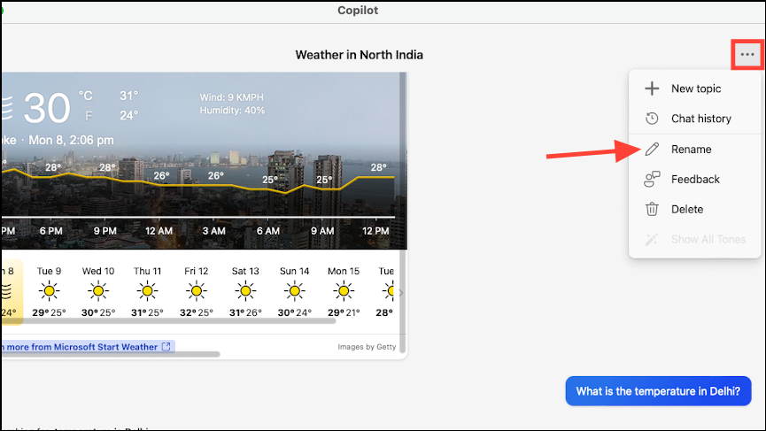 Step 4: Copilot automatically names each chat based on the context. To rename a chat, click the three-dot menu icon in the top-right corner and select Rename.