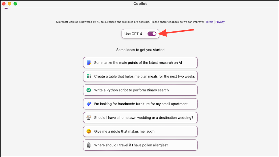 Step 2: To switch to the GPT-4 model, enable the toggle for Use GPT-4. By default, Copilot sets the tone to 'More creative' when using GPT-4. Keep in mind that responses may be slower compared to GPT-3.5.