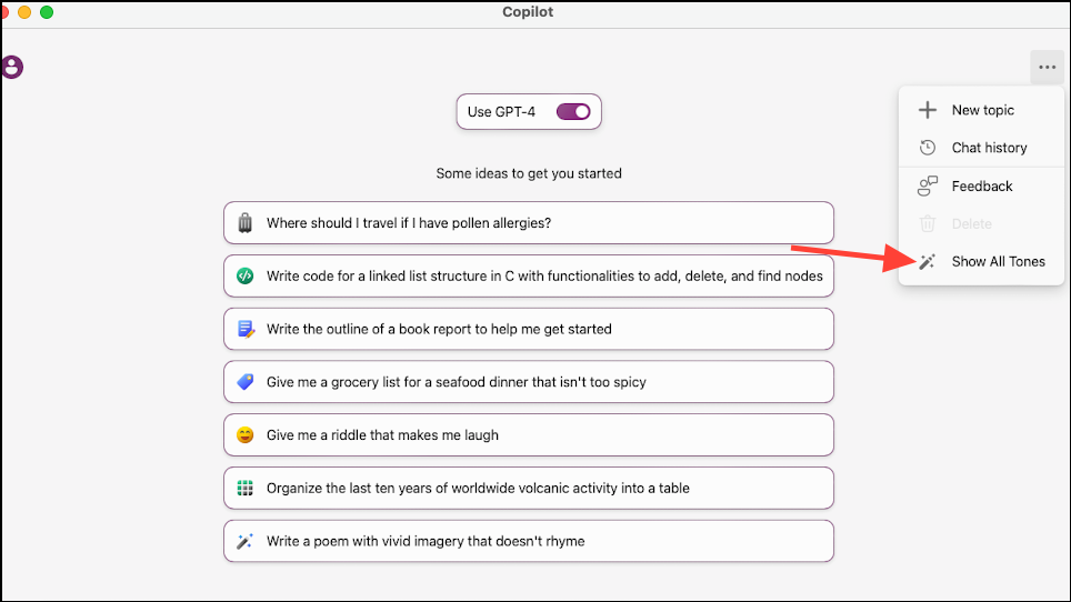 Step 4: To change the tone of Copilot's responses, start a new chat. Click the three-dot menu icon in the top-right corner and select Show All Tones.