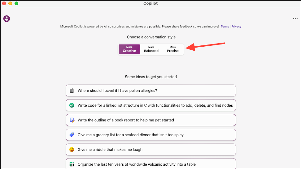 Step 7: Instead of typing, you can use voice input by clicking the Microphone icon. You'll need to grant Copilot access to your Mac's microphone.