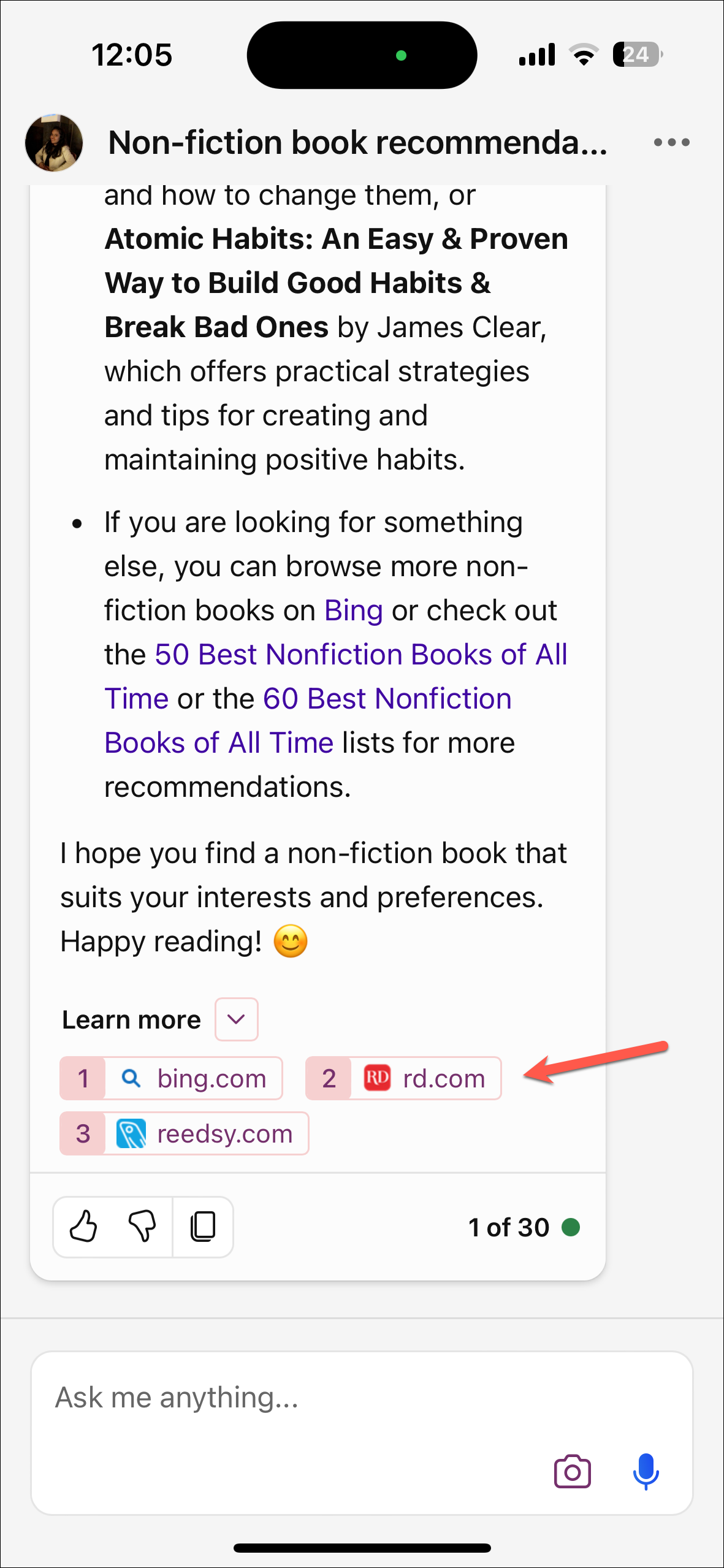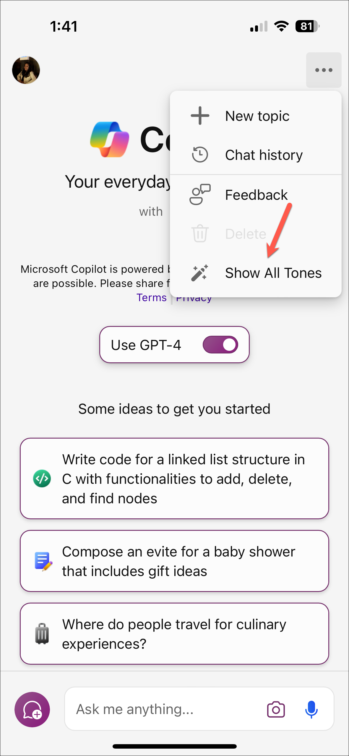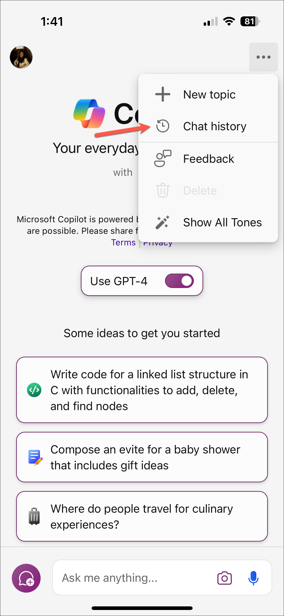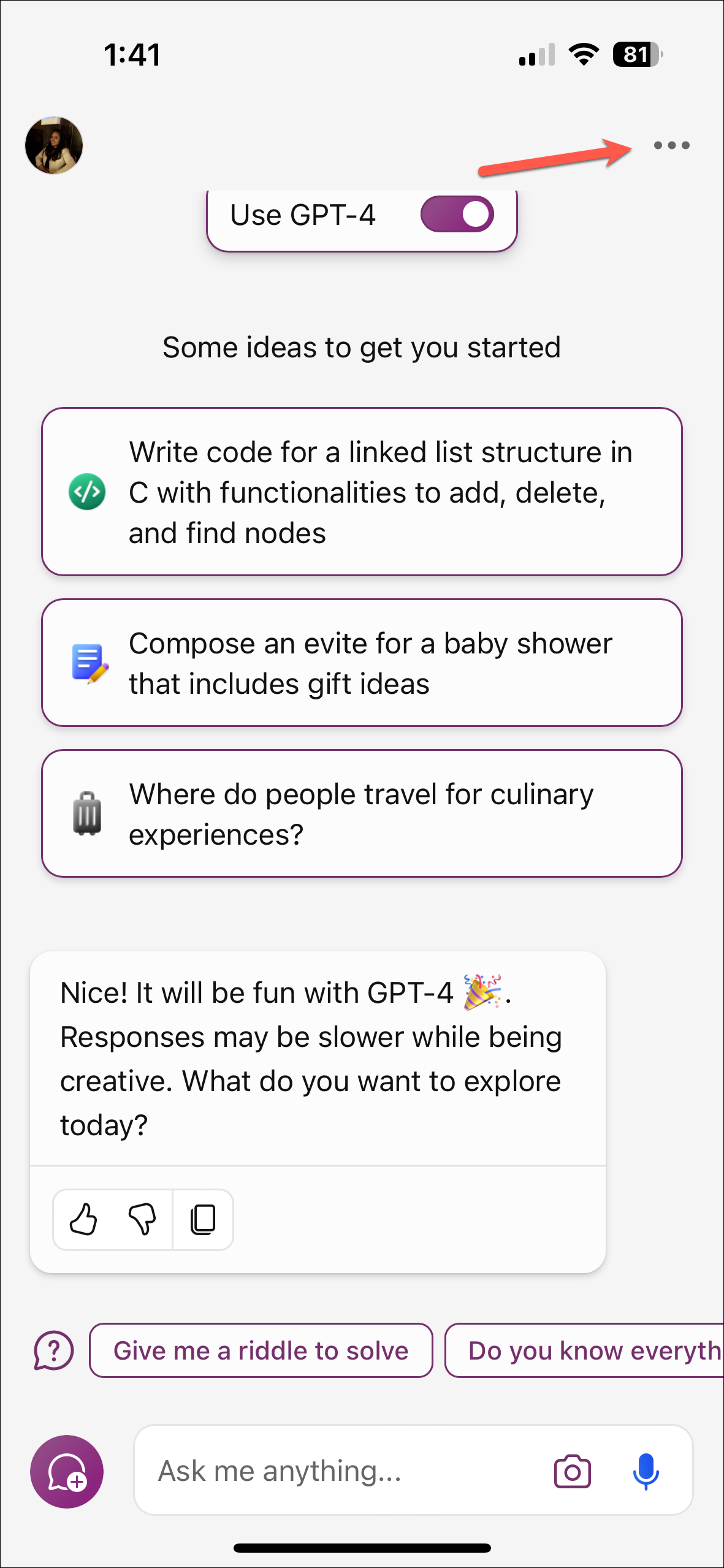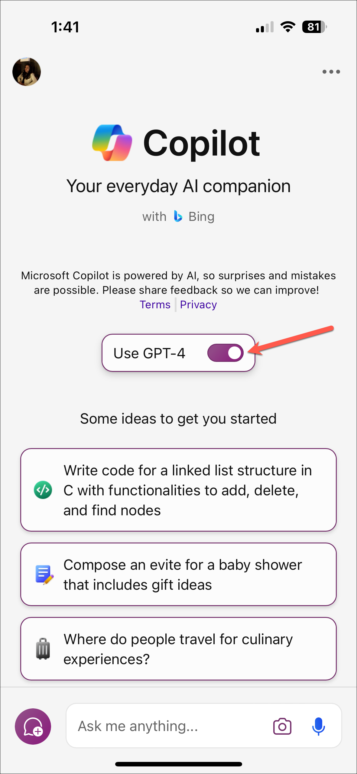 Now, using Copilot on your phone is simple. You can either chat with GPT 3.5, which is the default model in the mobile app or switch to GPT 4. The mobile app does not support Plugins.