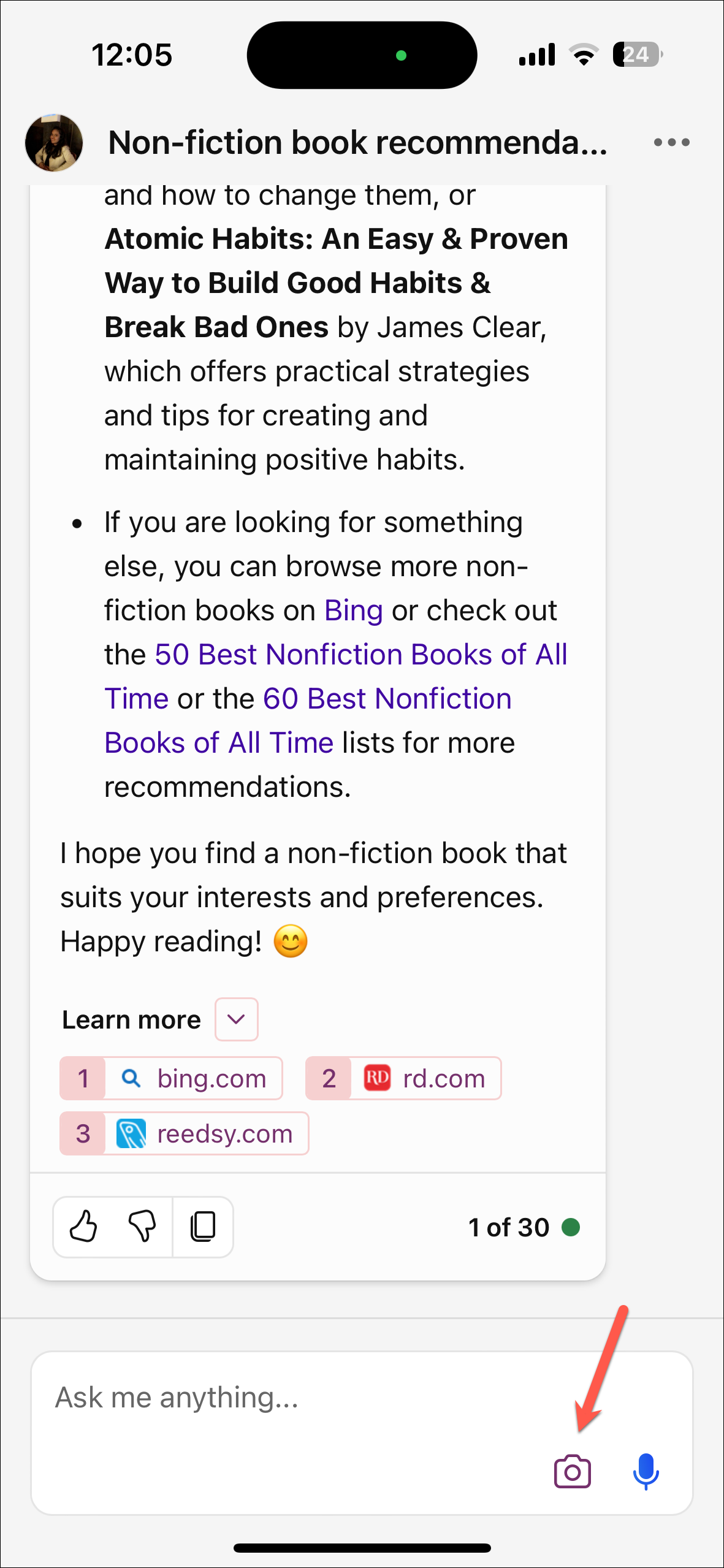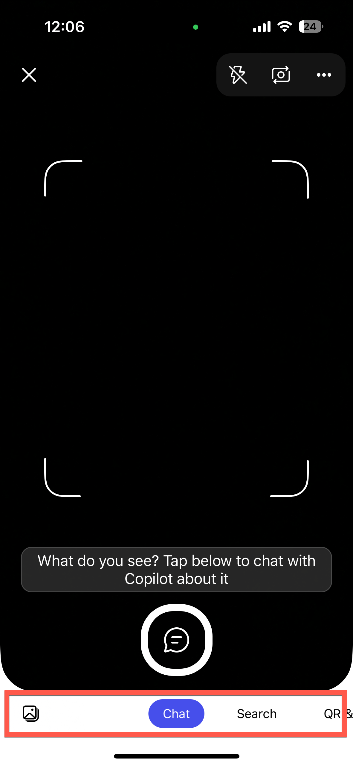 - Camera: You can use the camera to take pictures or scan QR codes. Copilot will then use the information in the picture or QR code to provide you with relevant information. You can also upload images from your gallery.