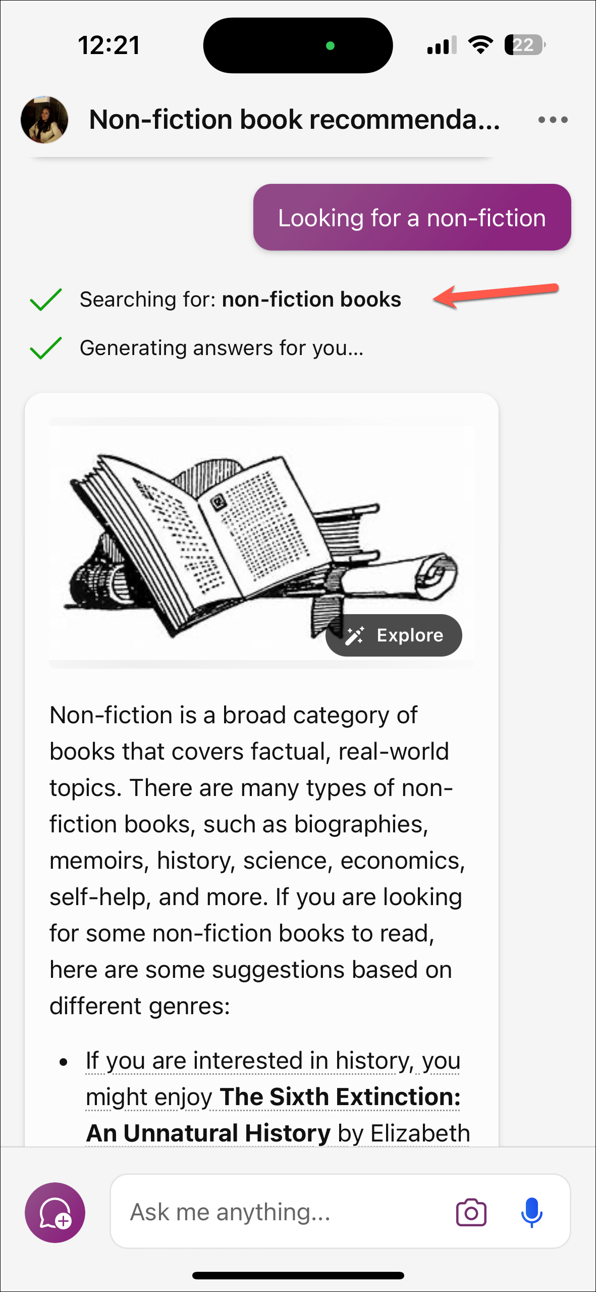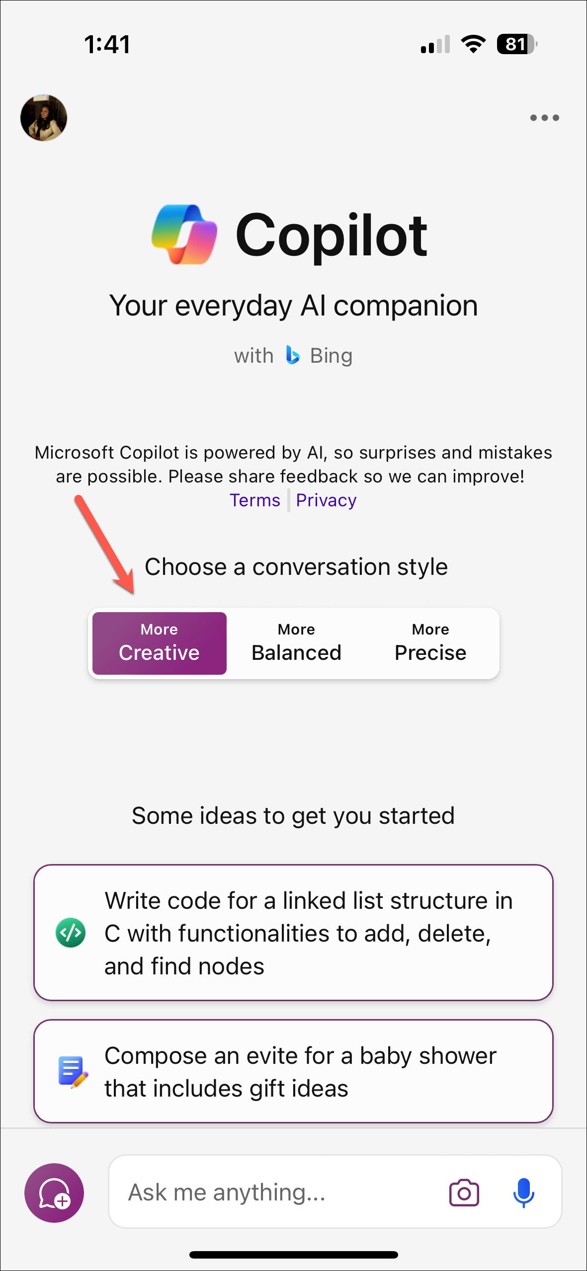 - To chat with Copilot, simply tap your query in the 'Ask me anything' textbox and tap the 'Send' button. You can also tap on one of the suggestions from Bing Chat to get started.