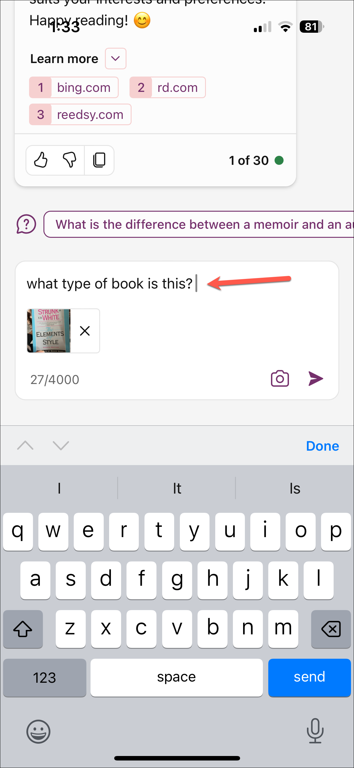 - Once the image is uploaded in the chat, type/ speak your query regarding it and send it to Bing Chat.