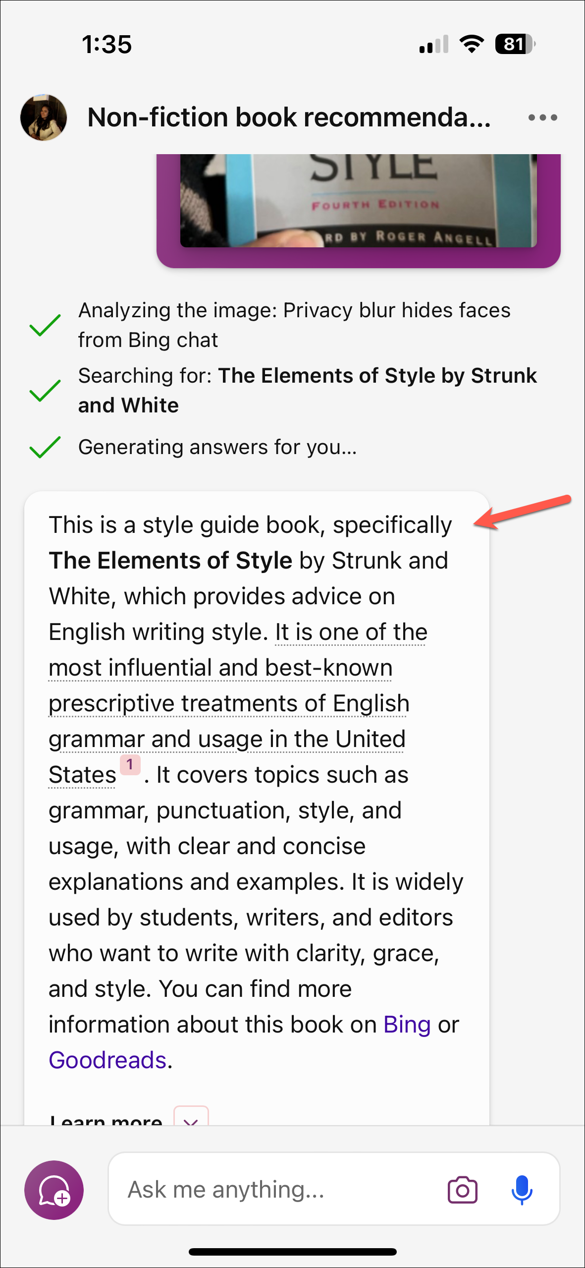 - Bing Chat will analyze the image and answer your query. You can even continue the chat about the image further as it is retained in context.
