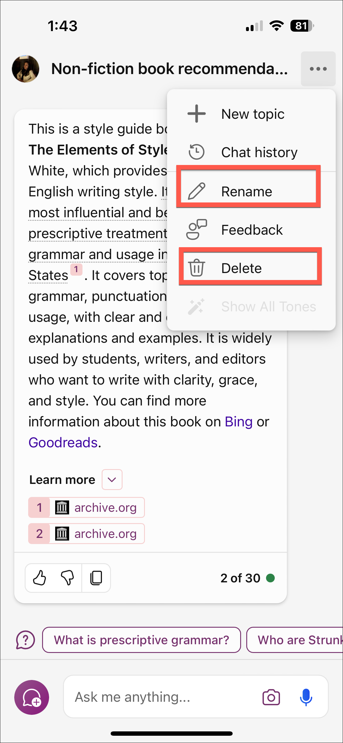 - Once a chat is open, you can also rename or delete it from the three-dot menu.