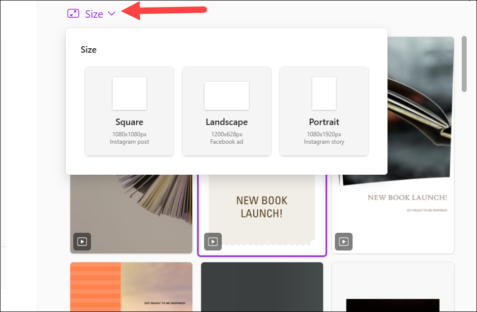 If you want to change the size of the generated design, click on the 'Size' option and choose an alternative from the drop-down menu. The designs will be regenerated in the selected size.