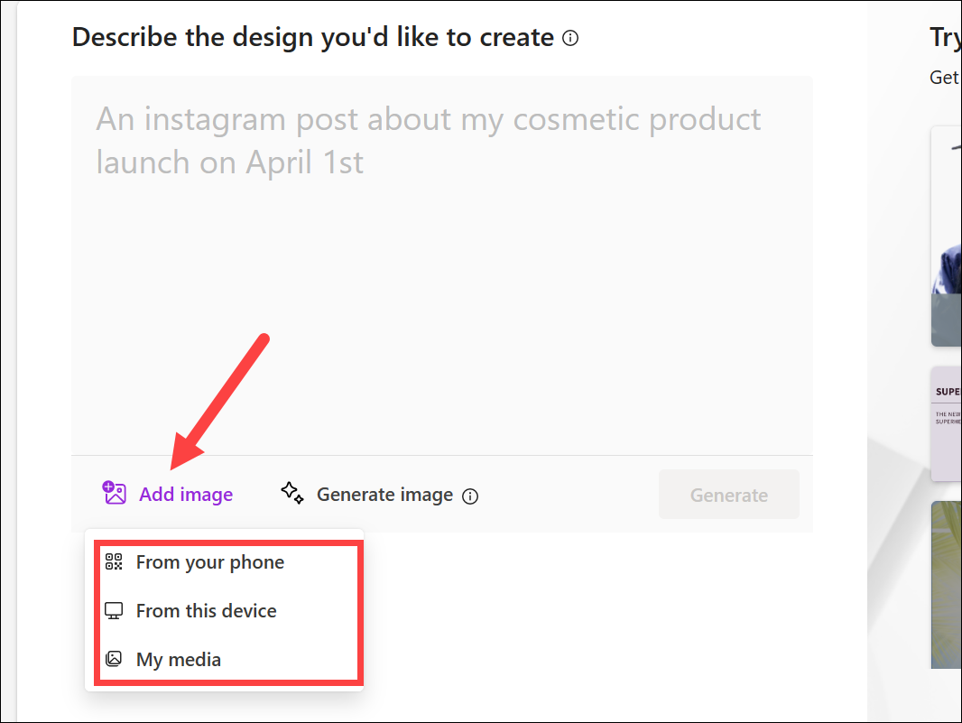 Similar to the above option, it's also available later in the Microsoft Designer Editor so you can generate an image before starting a design or in the middle of customizing it.