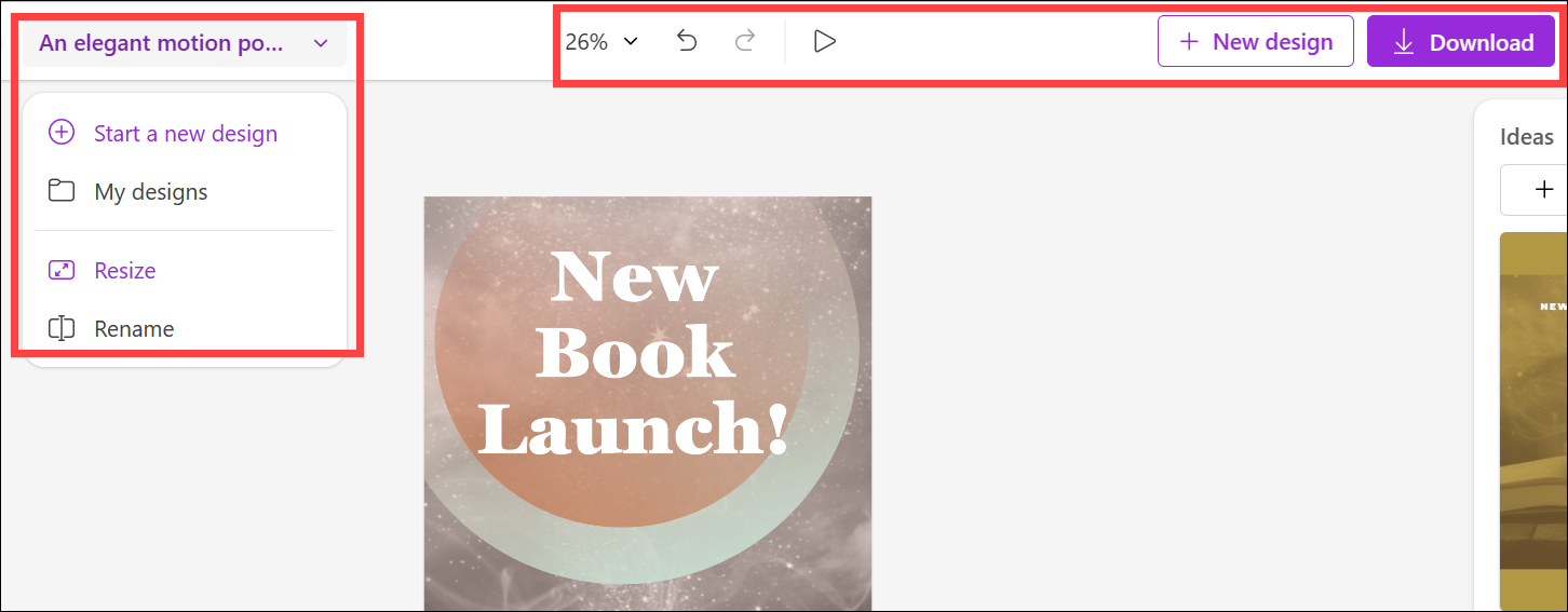 There's a possibility that Designer might have already generated some ideas for your design; you can scroll through them. Otherwise, click 'New Ideas' to get the AI to generate more ideas.