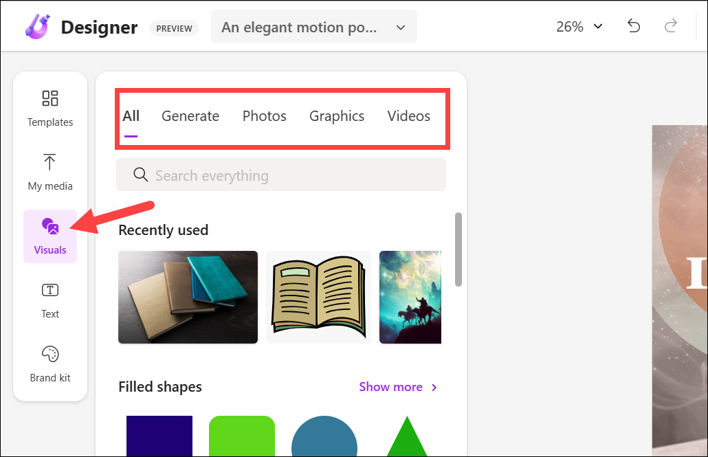 The 'Visuals' section is where the strength of the designing tool lies. From here, you can access Microsoft Desinger's library of graphics, photos, and videos.