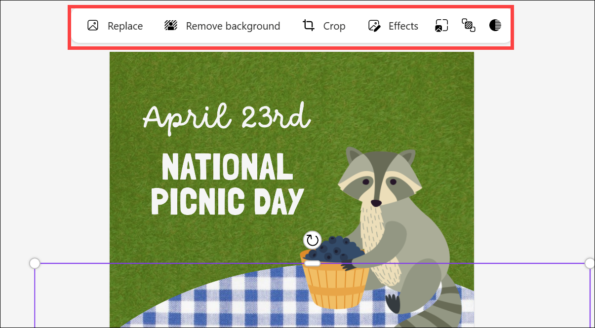 For example, for an image, it might have options like 'Replace', 'Remove Background', 'Crop', 'Effects', 'Set as Background', 'Position', and 'Opacity'. But the options can keep changing depending on the selected element.