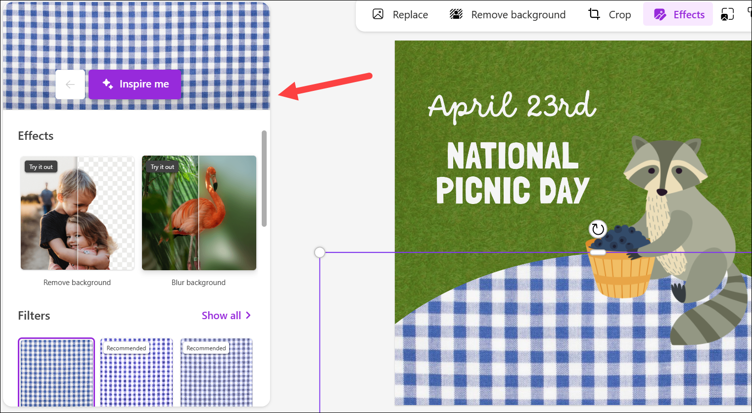 The AI can even randomly change the font style and color of the text if you're having difficulty selecting them. Simply click 'Inspire Me' and Designer will choose on your behalf.