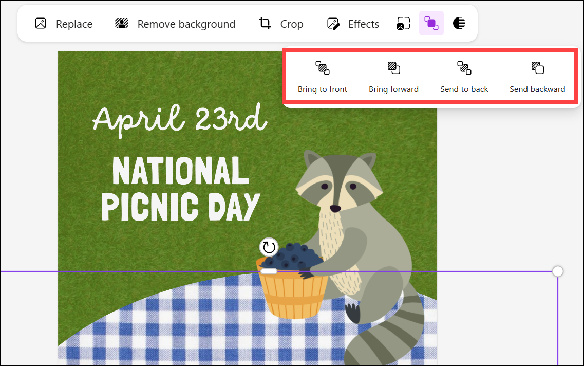 However, clicking the 'Positions' option will present more options, like sending the selected element to the back, front, etc. underneath the floating toolbar.