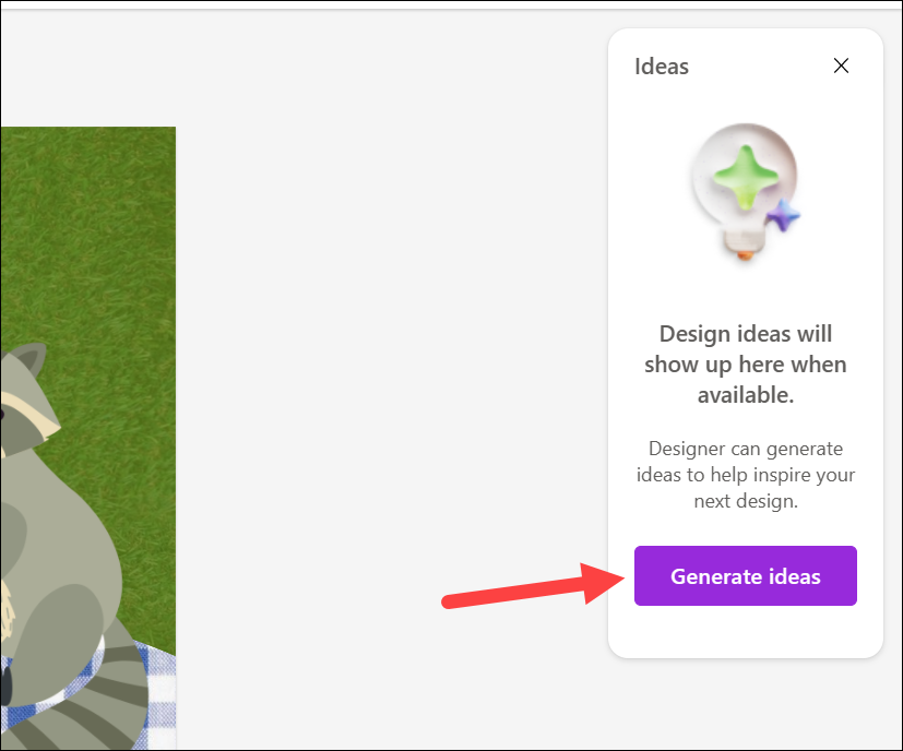 To generate new ideas for the design, go to the 'Ideas' panel on the right. If the panel is not visible, click the 'circular button with sparkles (✨)' to open it.