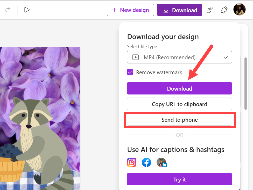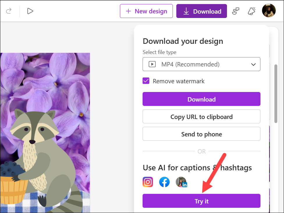 But if you want to share the design to social media sites like Instagram, Facebook, or LinkedIn, not only can you directly share it, the AI can even help you generate captions and hashtags.