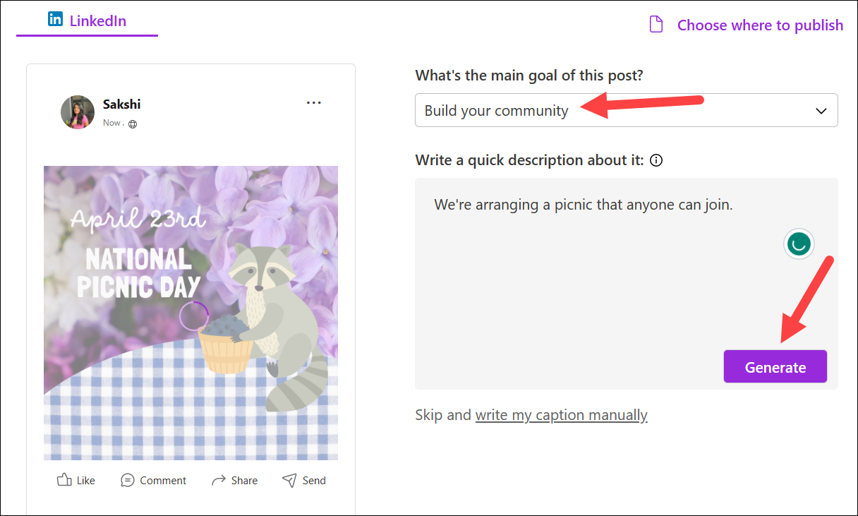 After connecting your account, tell the AI the goal of the post and give a brief description of what the caption should be.
