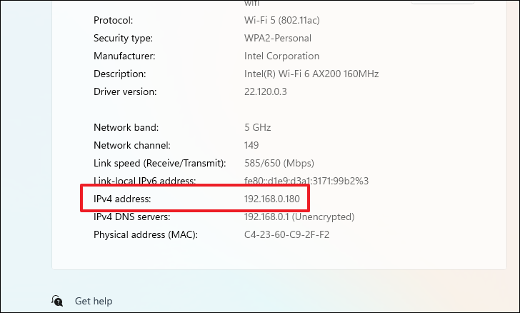 Step 12: Scroll down to the 'Properties' section and note the IPv4 address listed there.