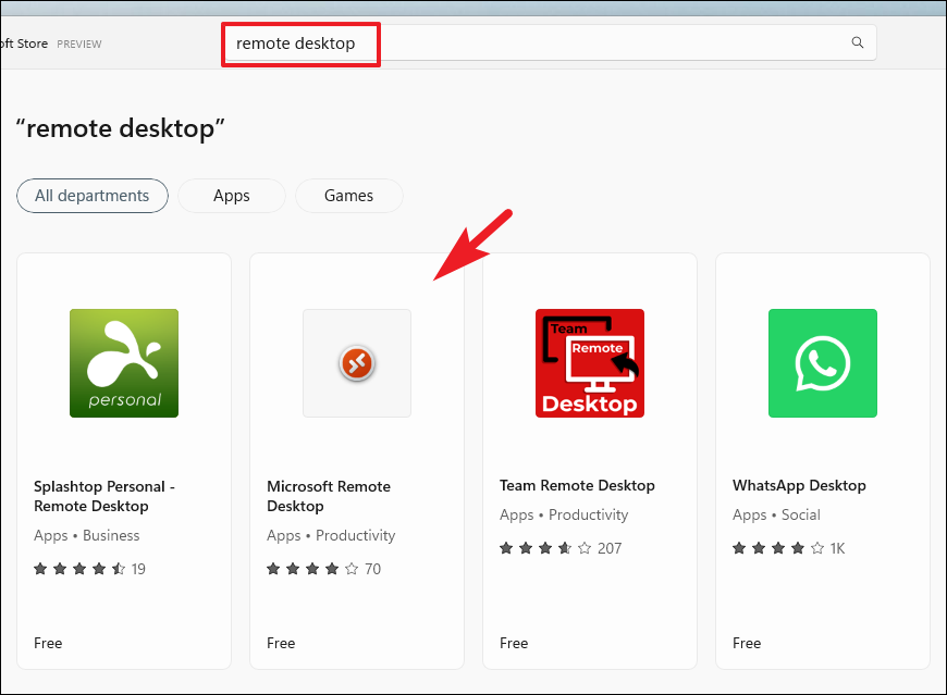 Step 2: In the Microsoft Store, search for 'Remote Desktop'. Click on the 'Remote Desktop' app from the search results.