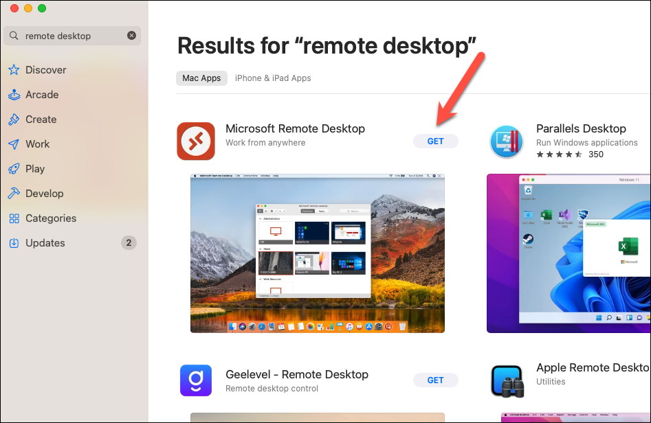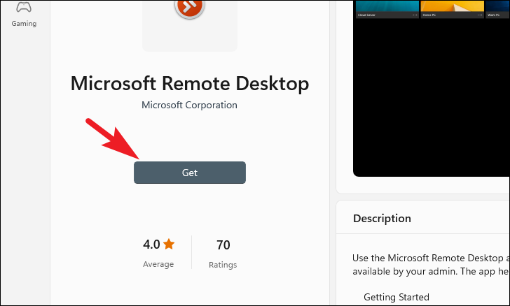 Step 2: Search for 'Remote Desktop' using the search bar. Click on 'Microsoft Remote Desktop' from the results and click 'Get' to download and install the app.