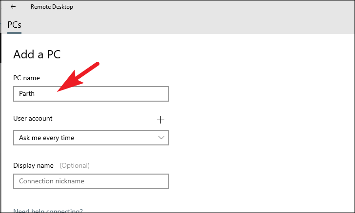 Step 6: In the 'PC name' field, enter the name or IP address of the PC you want to connect to.