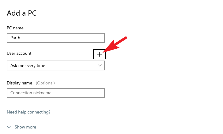 Step 7: Under 'User account', click the '+' icon to add your user account credentials for the remote PC. Enter the username and password, and optionally, a display name for the account. Click 'Save' when done.