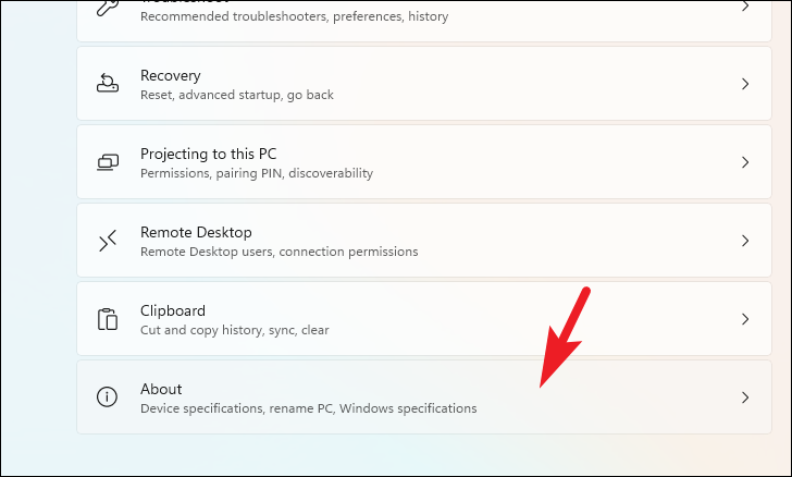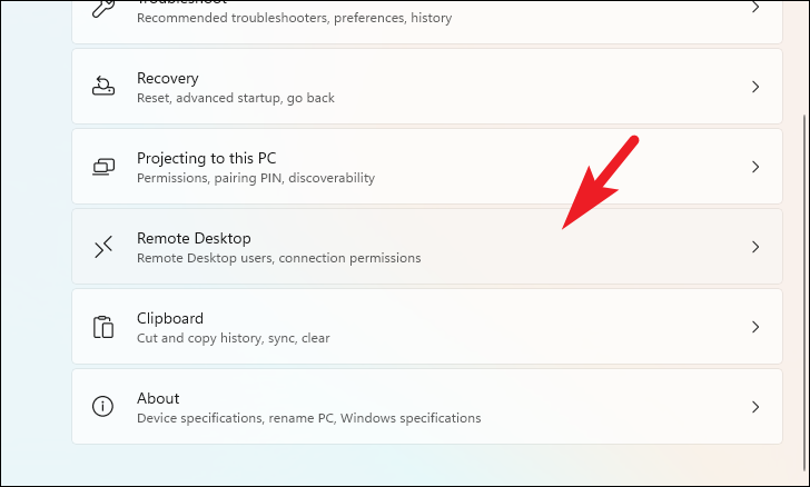 Step 3: Scroll down on the right pane and click on the 'Remote Desktop' option.