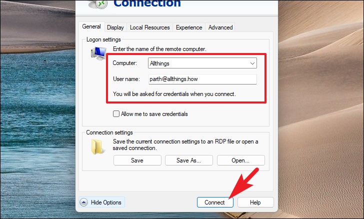 Step 3: In the 'Computer' field, enter the PC name or IP address of the remote computer. In the 'User name' field, enter your username (e.g., user@example.com). Click 'Connect' to initiate the remote session.