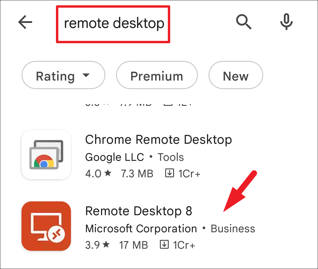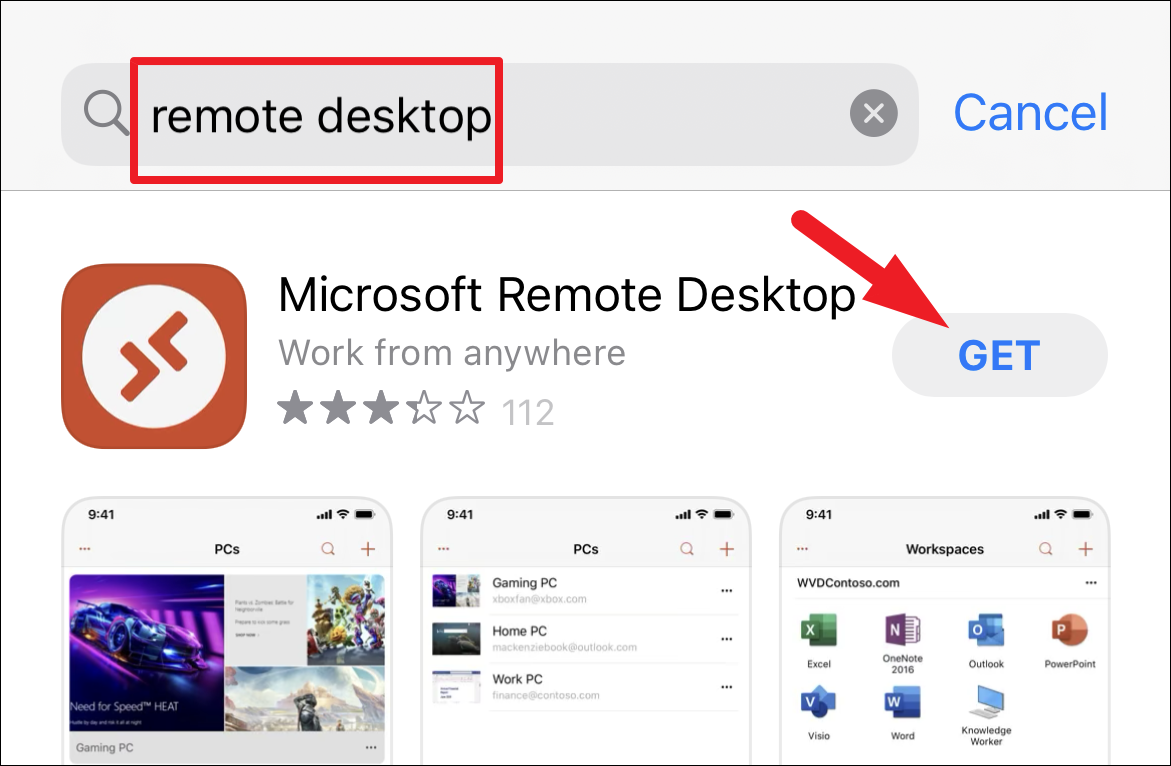 Step 2: Search for 'Remote Desktop' using the search bar. Tap on the 'Microsoft Remote Desktop' app from the results and tap 'Install'.