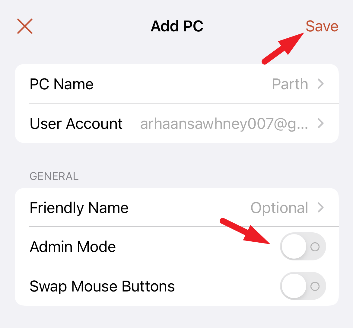 Step 3: Under 'User Account', enter your username and password for the remote PC. If you prefer to be prompted each time, select 'Ask when required'. Save the information by tapping or clicking 'Save'.