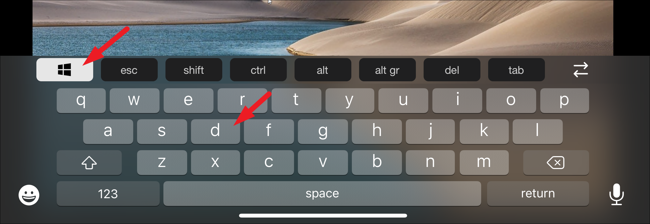 For keyboard shortcuts, tap the special key you need on the toolbar above the keyboard, then tap the shortcut key.