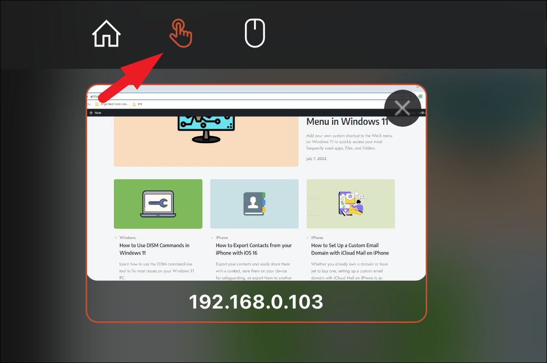 To switch between mouse and touch input, tap the 'Remote Desktop' icon in the toolbar, then tap the hand icon to switch to touch mode, which allows you to scroll and interact using touch gestures.