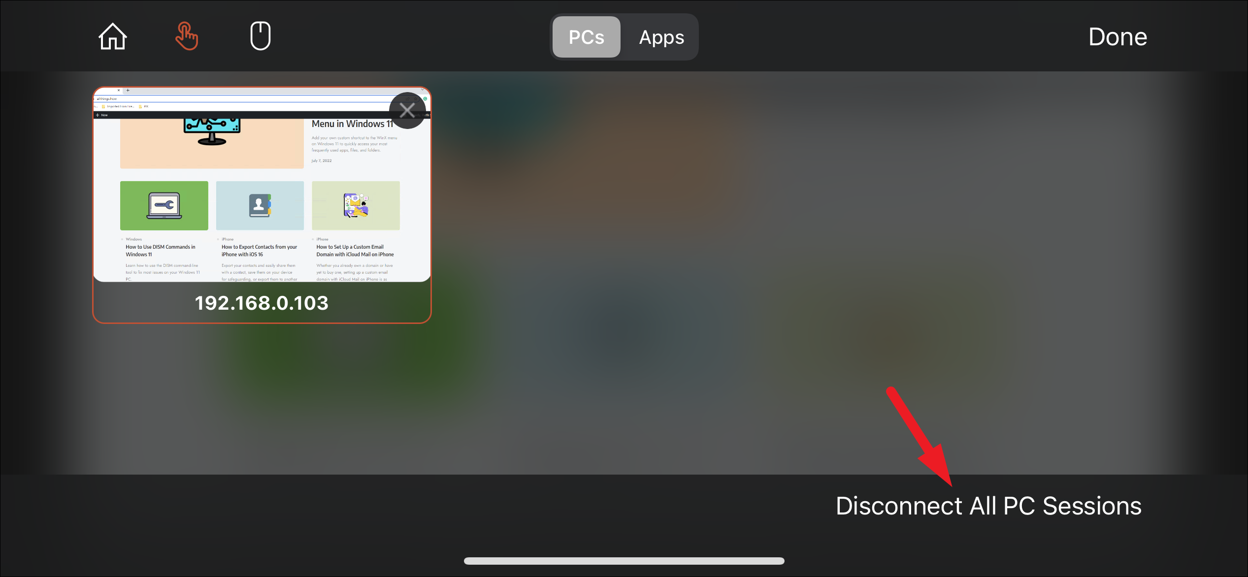 To disconnect the remote session, tap the 'Remote Desktop' icon and select 'Disconnect All PC Sessions' to end the connection.
