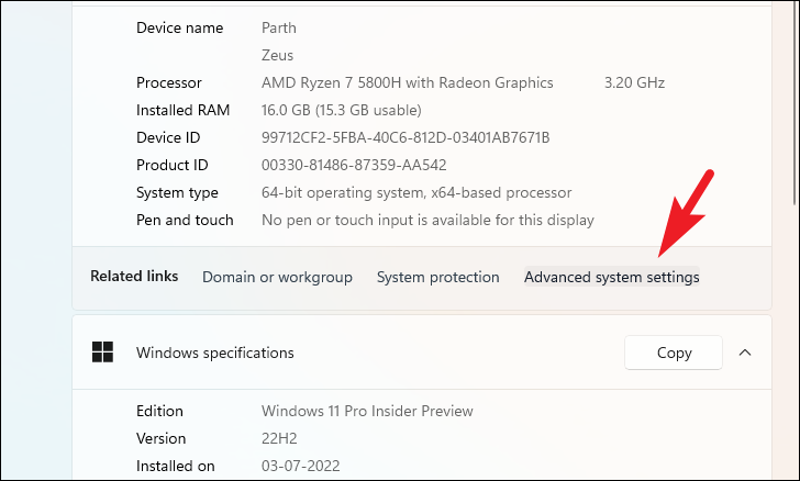 Step 7: On the 'About' page, click on 'Advanced system settings' to open a new window.