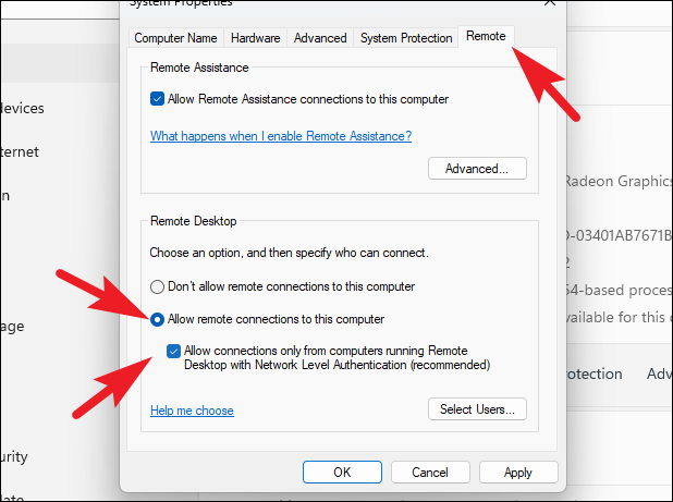 Step 8: In the System Properties window, go to the 'Remote' tab. Select 'Allow remote connections to this computer' and make sure the checkbox for 'Allow connections only from computers running Remote Desktop with Network Level Authentication' is checked. Click 'Apply' and then 'OK' to save the changes.