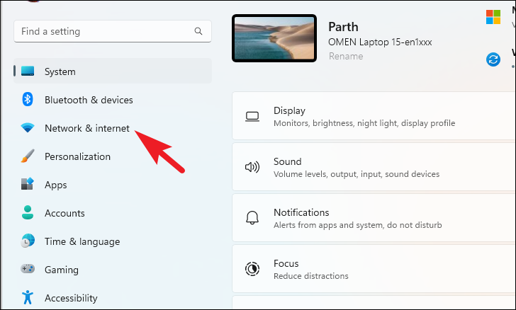 Step 9: In the Settings window, select the 'Network & Internet' tab from the left sidebar.