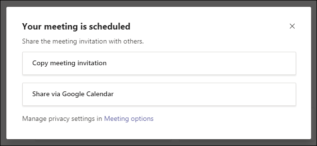 Step 7: Once scheduled, Teams provides options to invite attendees. You can copy the meeting invitation details to share directly with participants or use the 'Share via Google Calendar' option to send invites and add the meeting to their calendars.