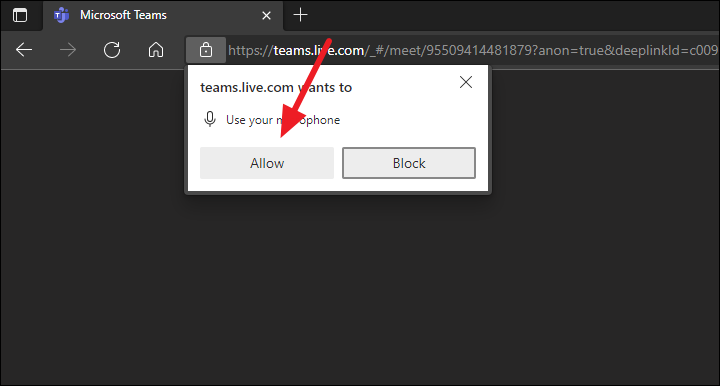 You can use Teams on either Google Chrome or Microsoft Edge browsers. When joining from the browser, you’ll receive a prompt from Teams asking to access your camera and microphone; click ‘Allow’.
