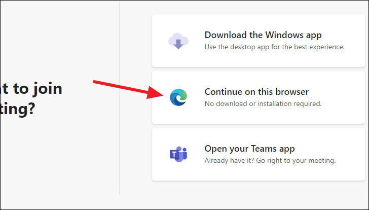 It’ll open on a web page where you’ll see two options: ‘Download the Windows app’, ‘Open your Teams app’ and ‘Join on the Browser instead’. Click the ‘Continue on this Browser’ option to continue without the app.