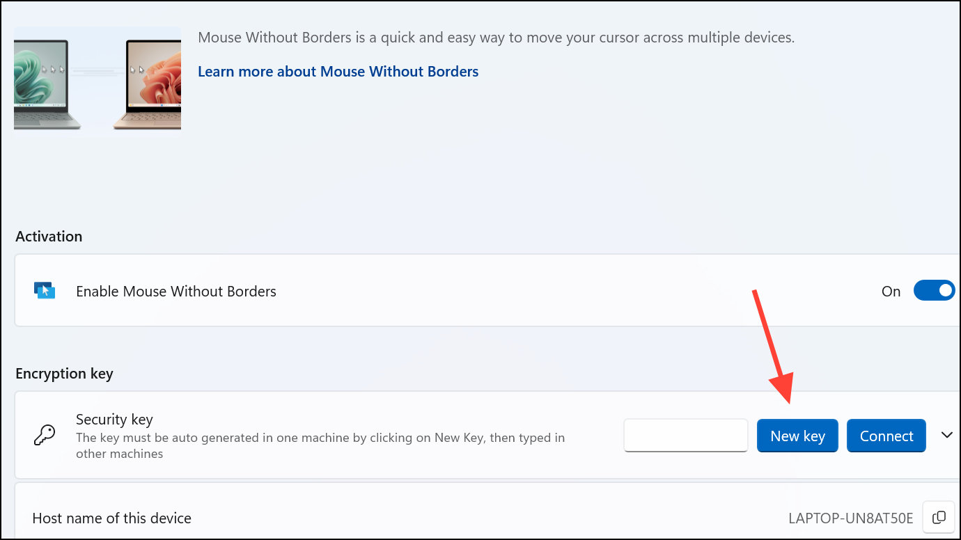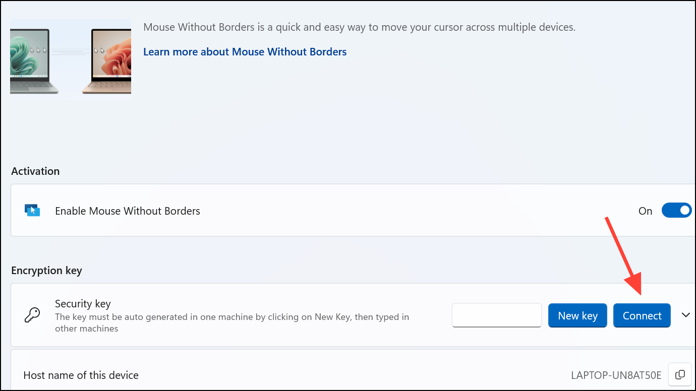 Step 4: On your secondary Windows 11 device, repeat the installation of PowerToys and enable Mouse Without Borders as described above. Instead of generating a new key, enter the encryption key and host name from your primary device into the respective fields. Then, click "Connect" to establish the link between the two computers.