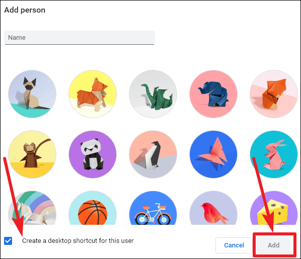 Step 2: A window will appear to set up the new profile. Choose a name and an icon for the profile, check the box if you want to create a desktop shortcut, and click Add.
