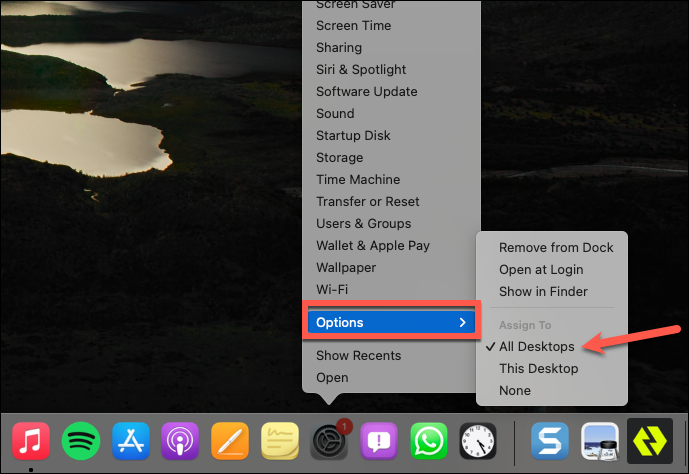 Step 2: Right-click (or Control-click) the app icon and hover over 'Options' in the context menu. You'll see the following assignment options: