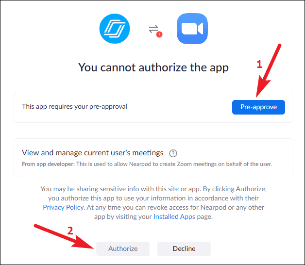 If this is the first time you’re trying to use Nearpod with Zoom, you will need to sign in to your Zoom account and authorize Nearpod access to your account. But before you can authorize, you need to pre-approve the app. First, click on ‘Pre-approve’, and then click on ‘Authorize’. If you have an organization Zoom account, then your Zoom admin needs to pre-approve access to the app.