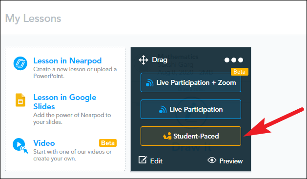 Now, the lesson will appear on your dashboard, and you can share it with your students. Hover on it, and a few options will appear. Now you can choose to share the lesson as a live lesson, student-paced lesson, or a live lesson with Zoom meeting (in beta).