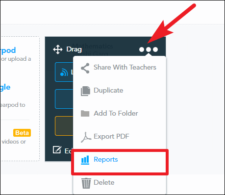 Teachers can view the reports for the lesson, whether it was a live participation session or a student-paced one. Hover over the lesson and then click on the ‘More’ icon (three dots). A menu will open; select ‘Reports’ from it.